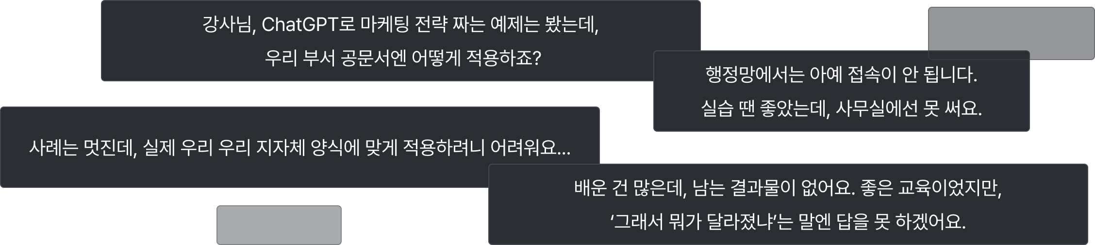AI 교육을 들은 공무원은 많습니다. 하지만 AI로 공문서를 작성하고, 민원을 처리하는 공무원은 드뭅니다.